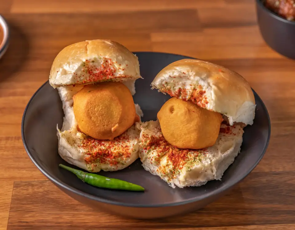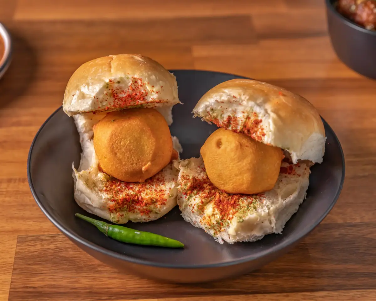 A spicy, sweet, and tangy potato filling inside a toasted bun with chutneys and crunchy sev