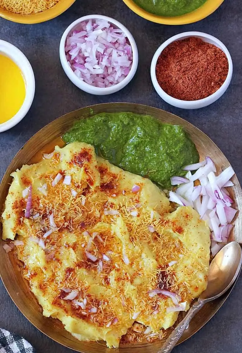 fermented chickpea batter steamed to a loose consistency and topped with BUTTER, spices and sev