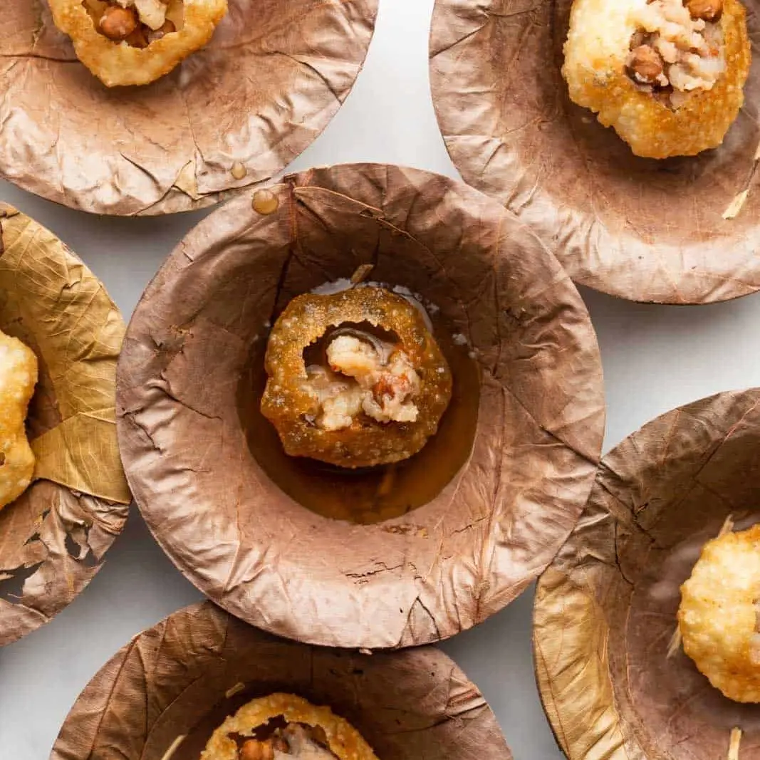Fried puff balls filled with SPICY mashed potato, HOT RAGDA and mint water
